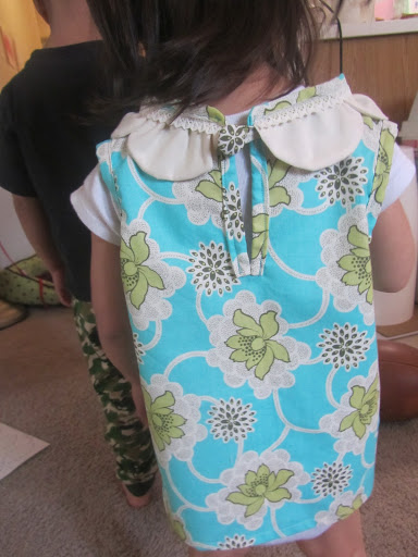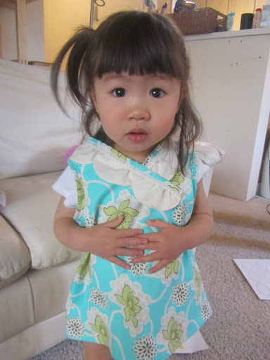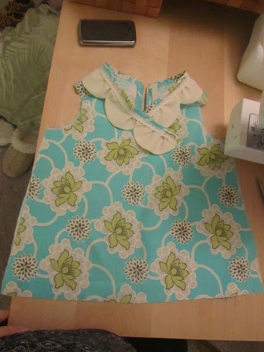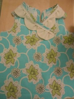 So I loved this look http://www.craftinessisnotoptional.com/2011/02/scallop-shirt-on-project-run-and-play.html and decided to try it out. I’ve done a sleeve once and didn’t want to tackle making my own pattern for the sleeve, so I just went sleeveless. My daughter’s in her onesie so it looks kinda funny… but ignore the white shirt she’s wearing under that shirt… and also her lack of pants. She’s figured out she can take them off