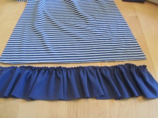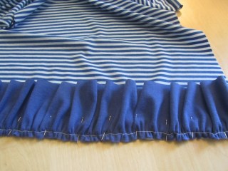 Now take the long strips you made for the ruffles, gather stitch them, then pin them onto the bottom of the dress w/ right sides together. Sew it together