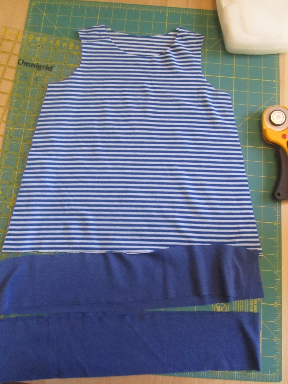 First off, I used the pattern I had for my daughter (which I made from tracing her shirt, add seam allowance), then cut out sleeves, and cut out two strips of fabric double the width of the bottom of the dress for the ruffles.