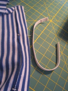 Then pin it onto the neckline while pulling the bias strip around the curves of the neckline. So when you go to sew it on, you’ll have to stretch the bias strip. That way your neckline isn’t stretched out and loose and ugly.