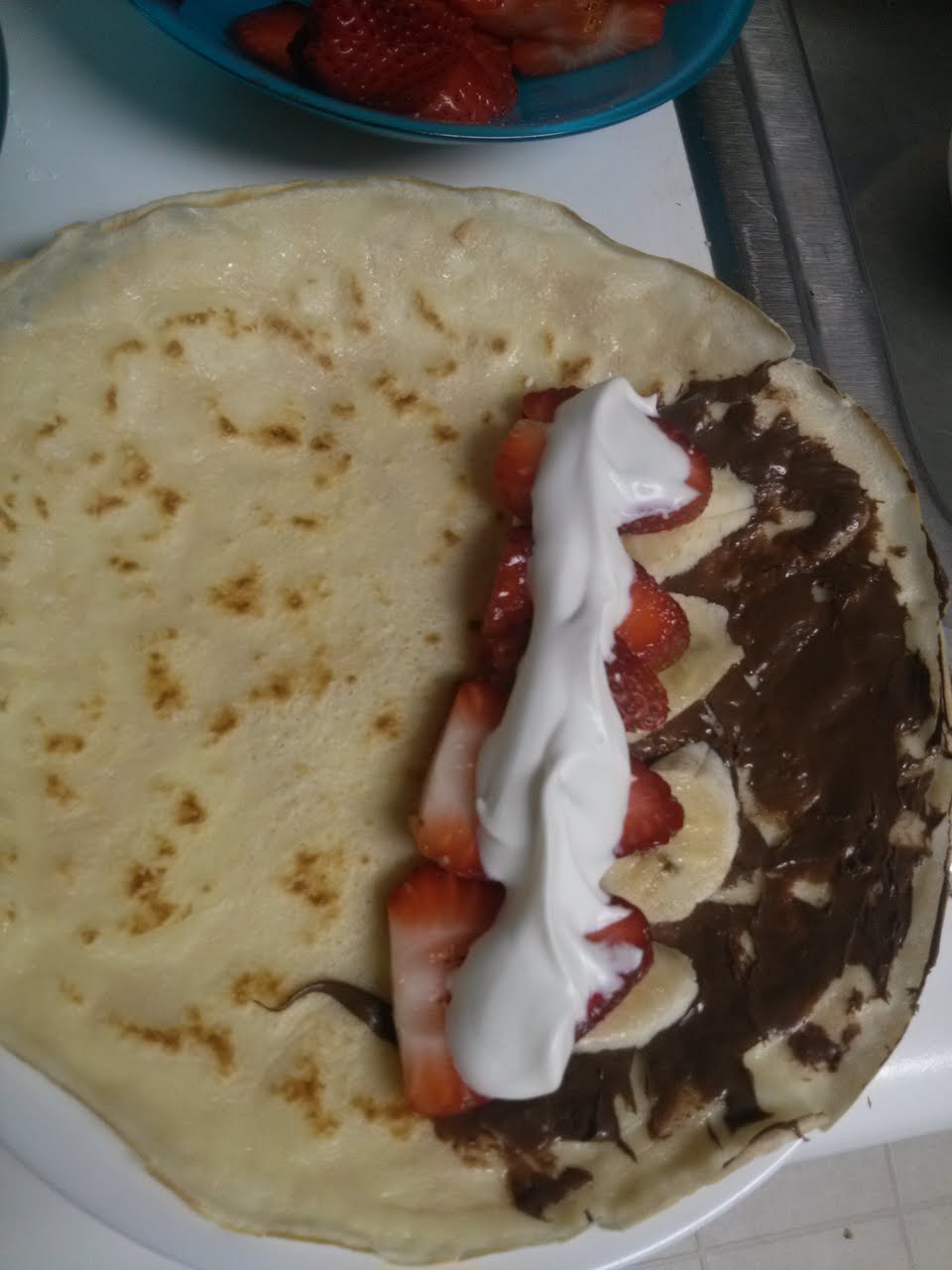 Spread half of the crepe with Nutella, top it off w/ as much bananas and strawberries as you’d like and add a HUGE “dollop” (ha ha) of whipped cream and roll it up kind of like a burrito…