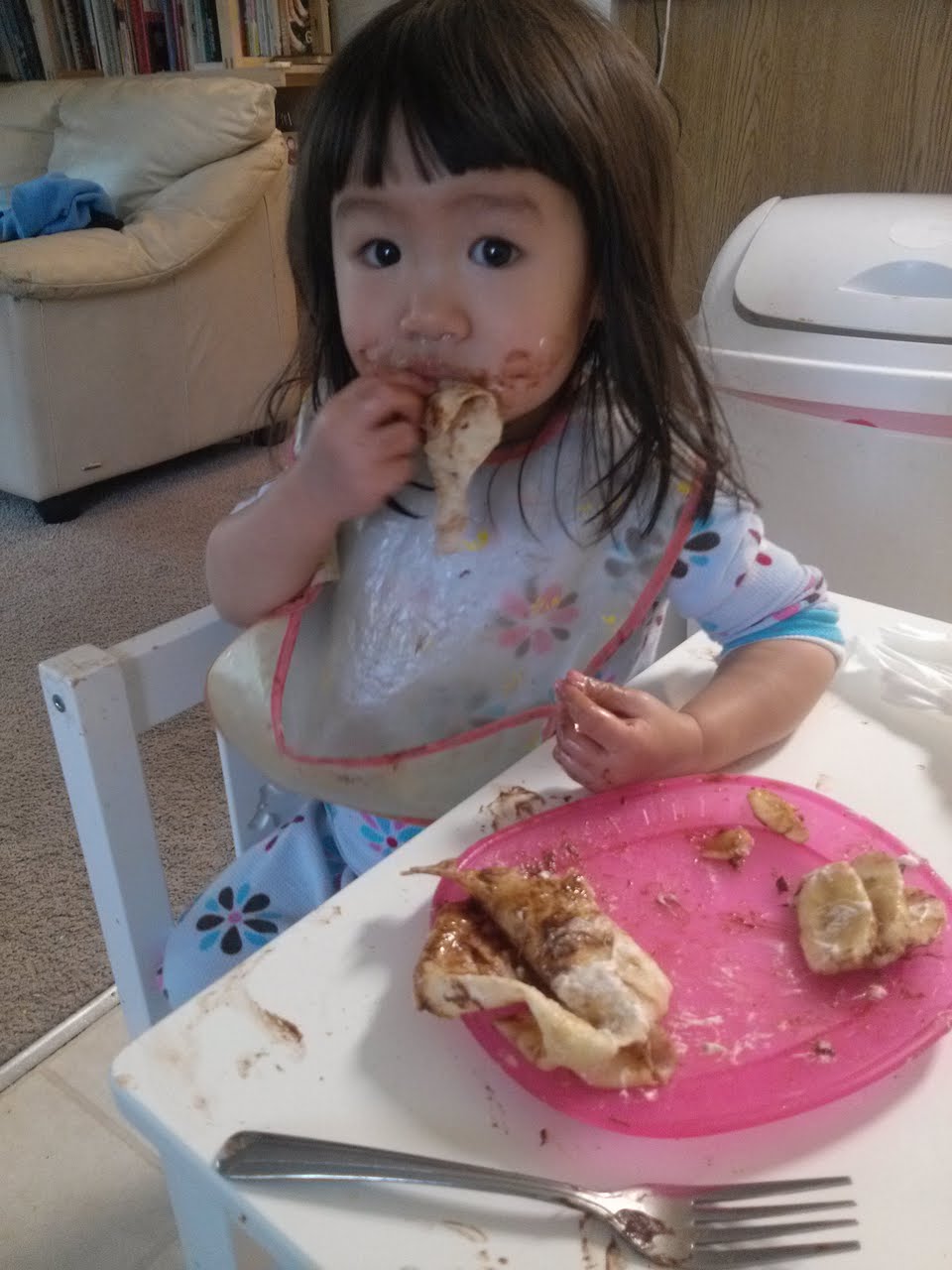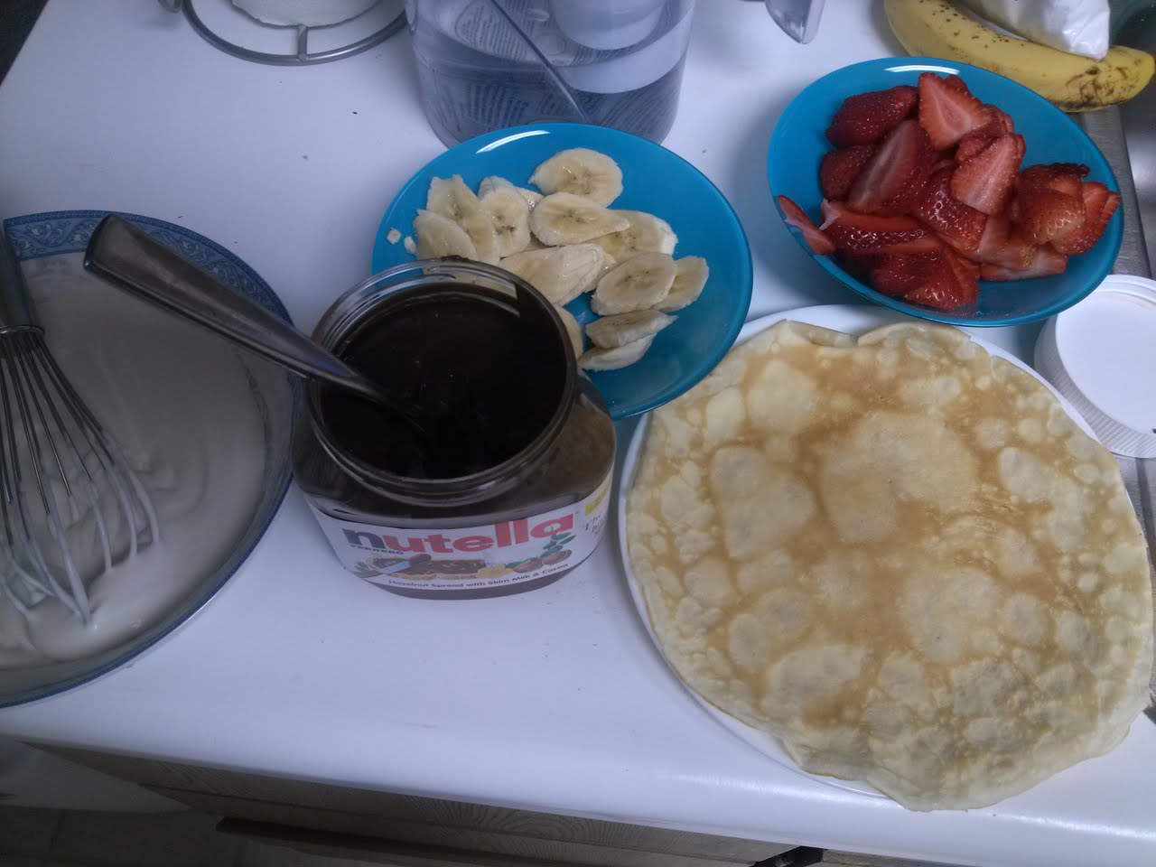 This morning was just a crepes morning. I had all my favorite ingredients so just needed to whip up the crepes and here’s the recipe I used: http://allrecipes.com/recipe/basic-crepes/ I’ve used this recipe many times and always works just great. So I whipped up some crepes while the kids whined about breakfast (cereal is a lot quicker… although this crepes recipe is faster than pancakes).