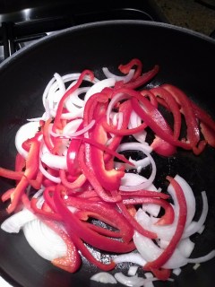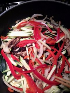 Heat a wok over high heat until very hot and add 2 TBS canola oil. Stir-fry the bell peppers and onions for about 2 mins until almost tender. Add the mushrooms and zucchini and cook for about 2 more mins then transfer all the vegetables to a plate/wide bowl.