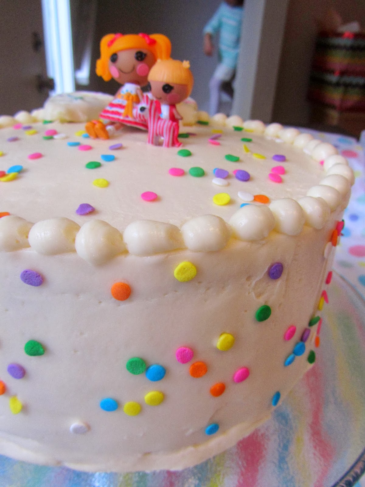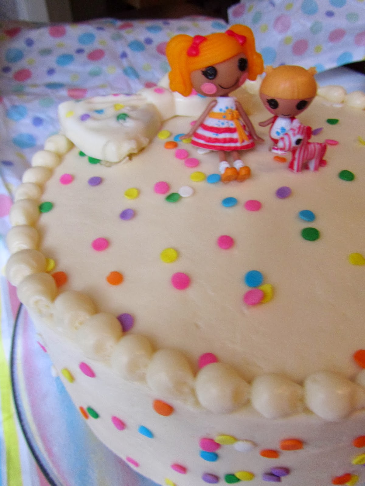 Garden’s Six-layer strawberry cake but I didn’t use their frosting recipe for the outside of the cake, which would also have been a cream cheese recipe, just without the pink tint and the chopped strawberries. Instead I used my favorite French Vanilla recipe from Toba Garrett’s “The Well-Decorated Cake” (see recipe at bottom of post). This buttercream tastes great (“like vanilla ice cream”) and frosts smooth and keeps shape well as long as it’s not too warm. For the bow behind Spot, I added confetti sprinkles to a Bow-Tie candy mold and filled it with melted white candy melts. After frosting the cake, drop and throw the confetti sprinkles on the cake and place your washed lalaloopsy to finish it off.