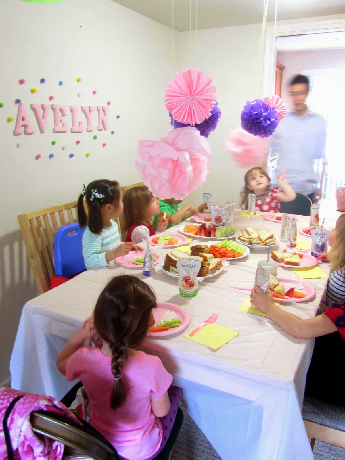 The party feast in action: PB&J sandwiches and cream cheese-cucumber sandwiches, fruit and veggie platters, plenty of sweet treats, and Avie’s favorite salty snack: pirate booty.