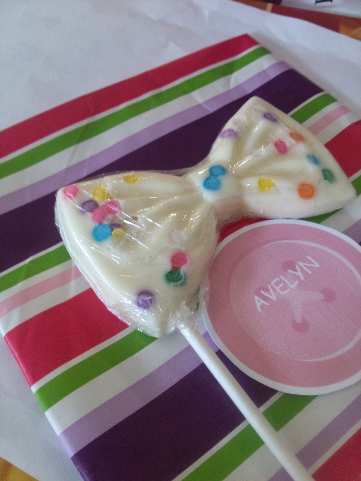 I forgot to take pictures of their party favors, so I took one of an already unwrapped one (please excuse the wrinkles) I saved for my daughter but basically got Lalaloopsy paperback books from Amazon, wrapped them up and added a white-chocolate bowtie lollipop (same as on cake) on the front.