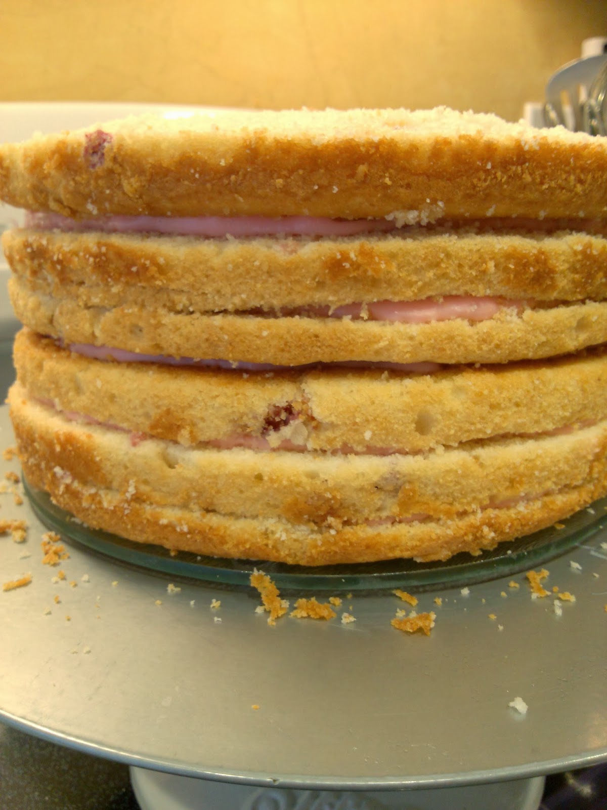 6-layer strawberry cake with strawberry cream-cheese filling, frosted with vanilla buttercream