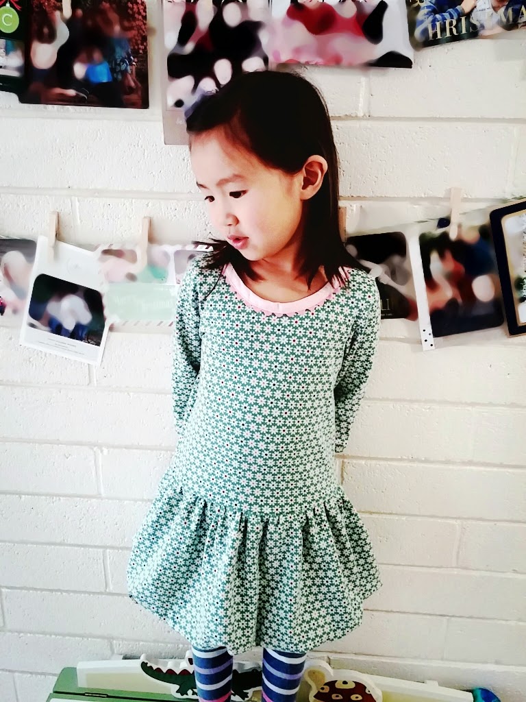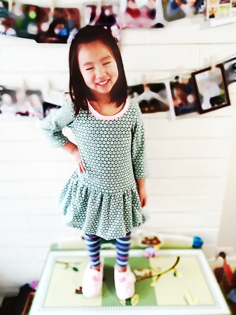 While making the dress I made a few notes to myself and one of those are that the sizing of the dress seemed to be quite a bit on the larger side. I made two dresses, one for my almost-5-yr-old and one for my 3-yr-old. The one pictured is the size 3T that fits my almost-5-yr old. It was too big for my 3-yr-old so she’ll have to wait until it’s “handed” down to her, like a lot of her other clothes… And the size 5T dress I made is way too big so my 5-yr-old, so she will have to grow into it later.