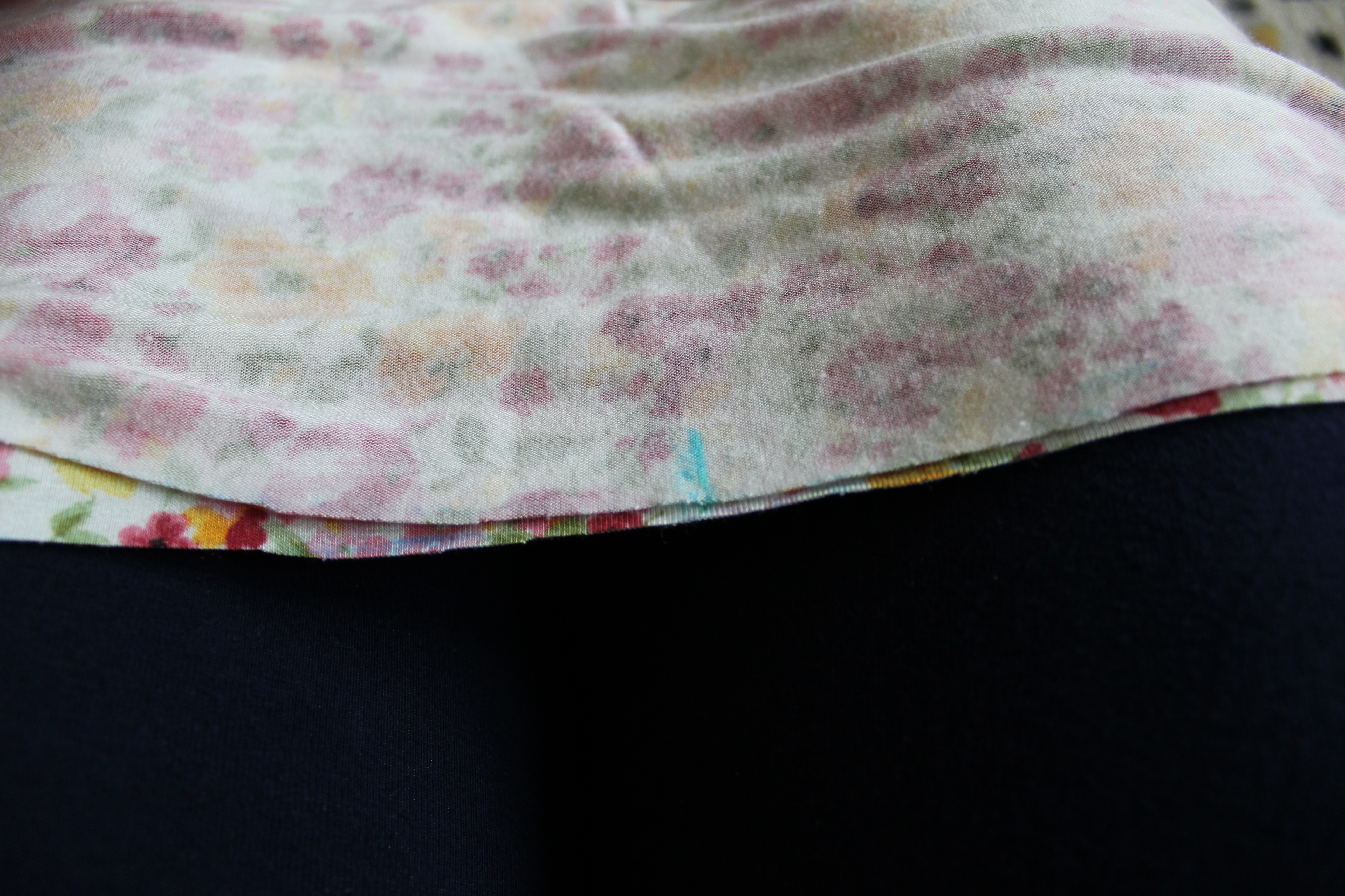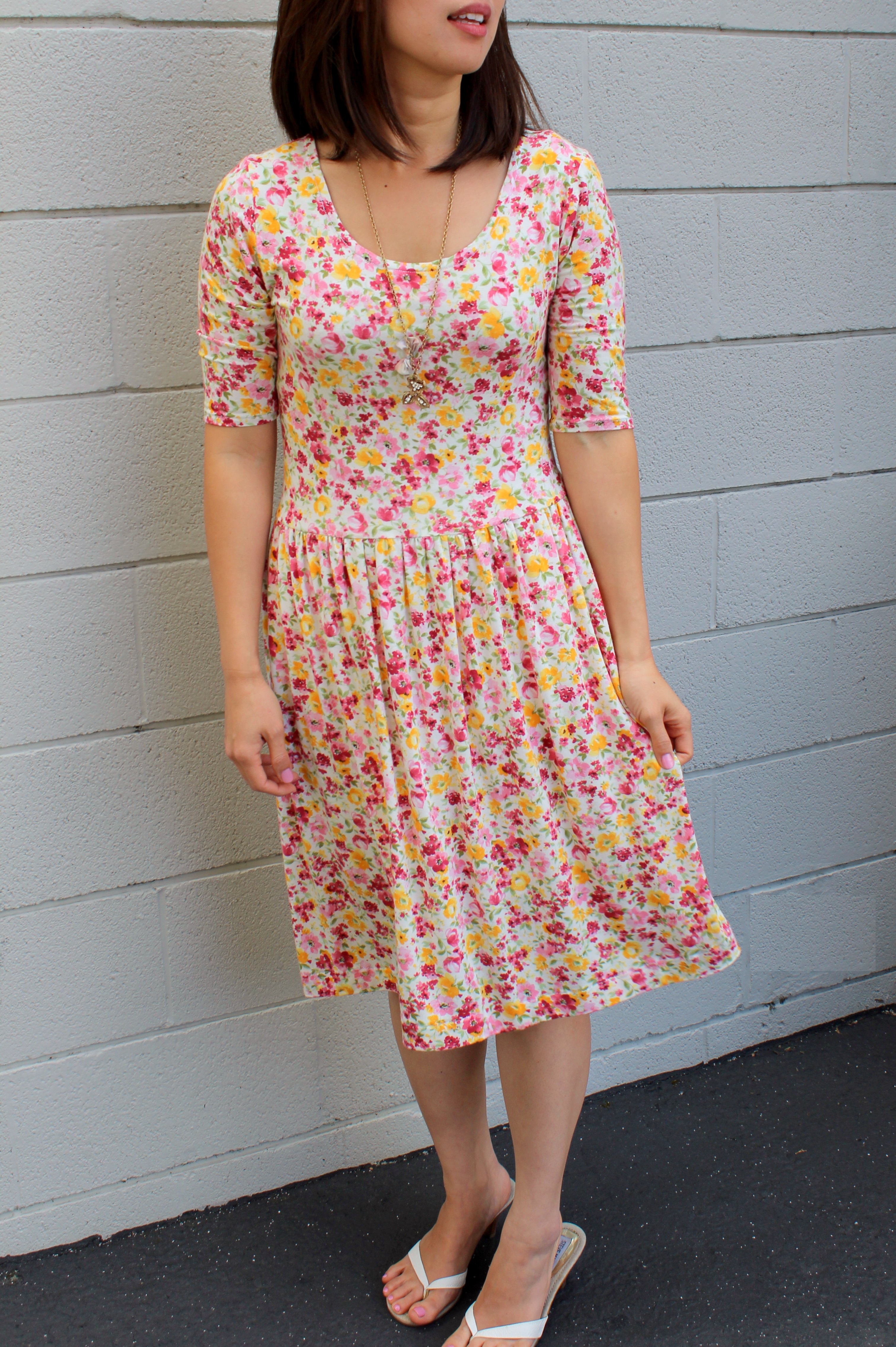 The only thing I changed to turn the peplum top into a dress, was to change the length and width of the “peplum” portion of the pattern. I had 62″ width of the flower pattern fabric and used that width with 25″ for the length of the skirt. I think I may shorten the width next time so there aren’t so many gathers around the midsection, which can end up widening your waistline. The skirt portion ended up hitting me right below the knee, although I was aiming more for right above the knee, but it works. And of course you can make it even longer and turn it into a maxi dress.