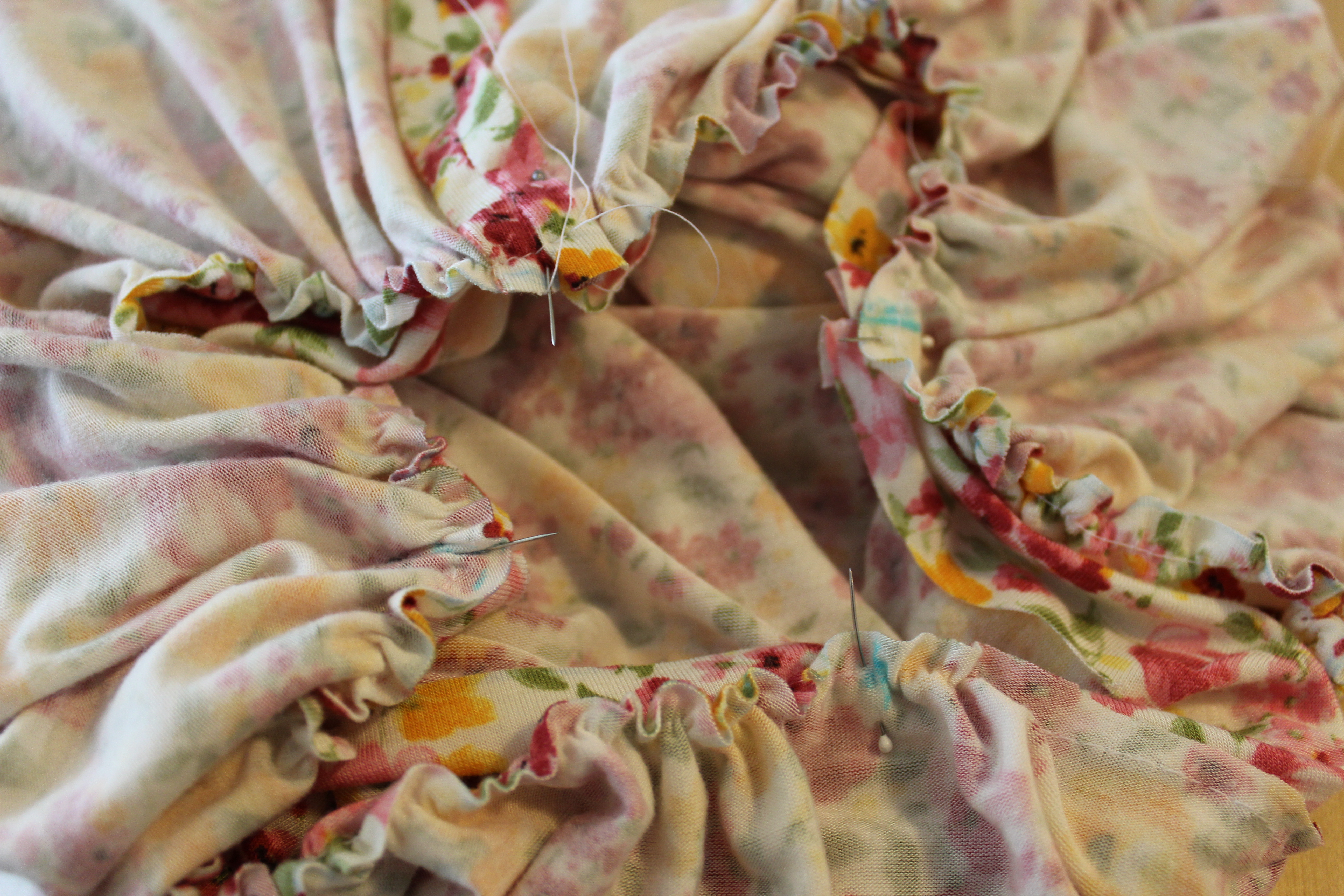 I like to make marks at the halfway point between side seams on the bodice and the skirt to help me pin them so the gathers are evenly distributed.
