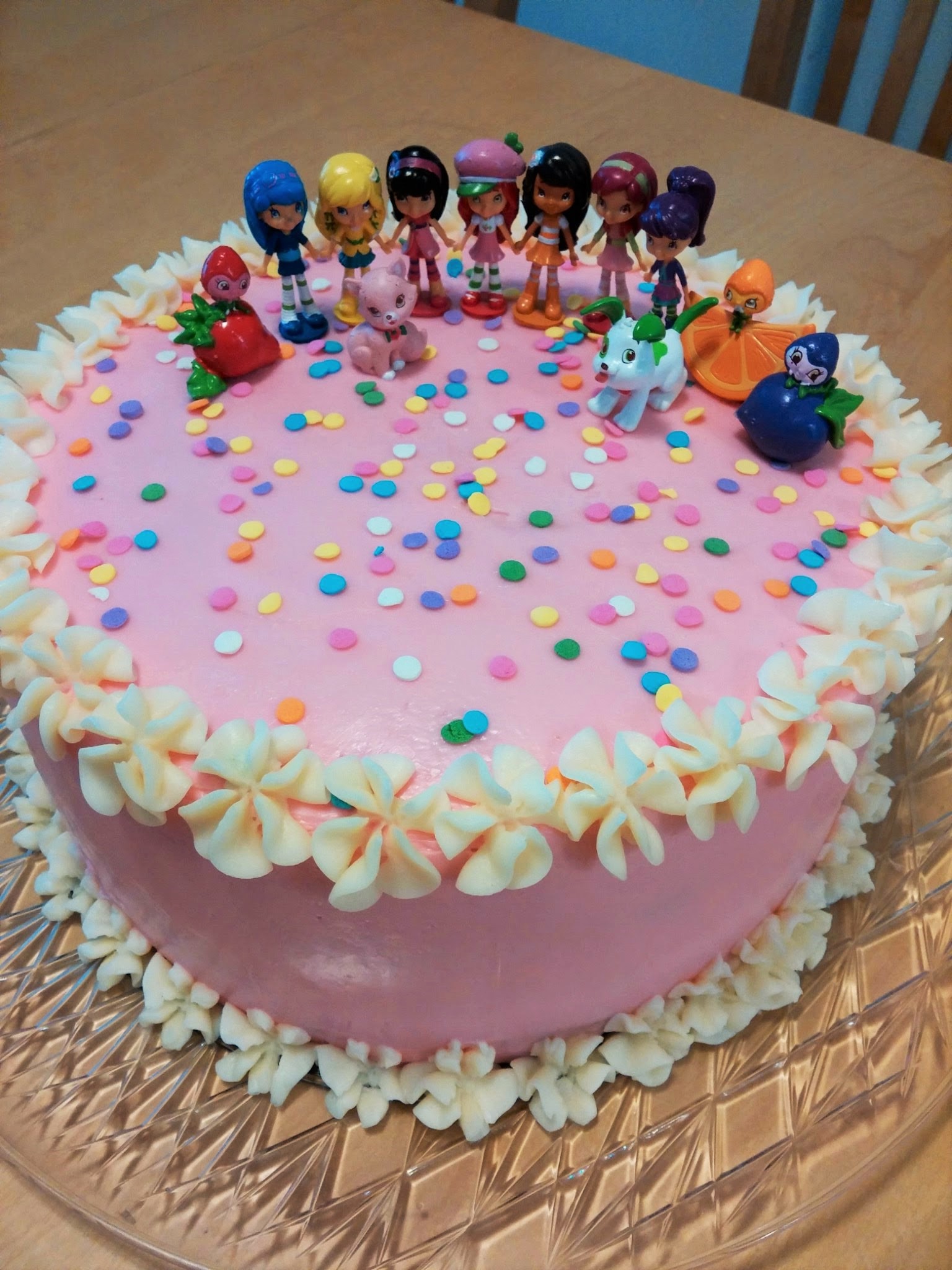 For the party favor, I wrapped a Strawberry Shortcake coloring book in brown wrapping paper, then placed the necklace, crayons and a Strawberry Shortcake tattoo in a pink polka dot baggy (Target).